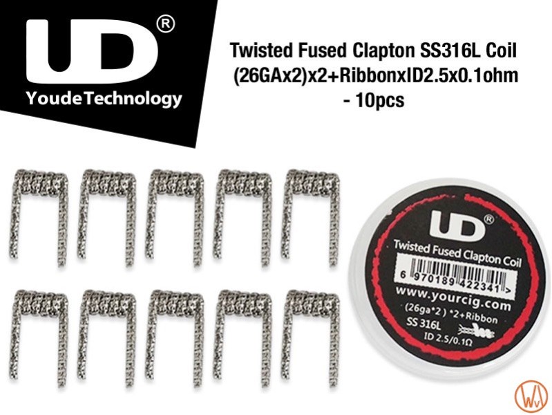 Das UD Twisted Fused Clapton Coil, hergestellt aus SS316L Edelstahl, hat einen Innendurchmesser von 2,5 mm und einen Widerstand von 0,1 Ohm. Diese Coils sind dafür ausgelegt, mit einem regelbaren MOD und hoher Wattzahl, gewaltige Wolken zu erzeugen. Verpackungsdetails: 10 Stk. UD verdrillte geschmolzene Clapton SS316L Spule (26GAx2) x2 + Band x ID2.5 x 0.1Ohm, Technische Daten: Innendurchmesser: 2,5 mm, Material: (26GAx2) x2 + (0.5x0.1) xID2.5x0.1ohm, SS316L Edelstahl, Widerstand: 0,1 Ohm